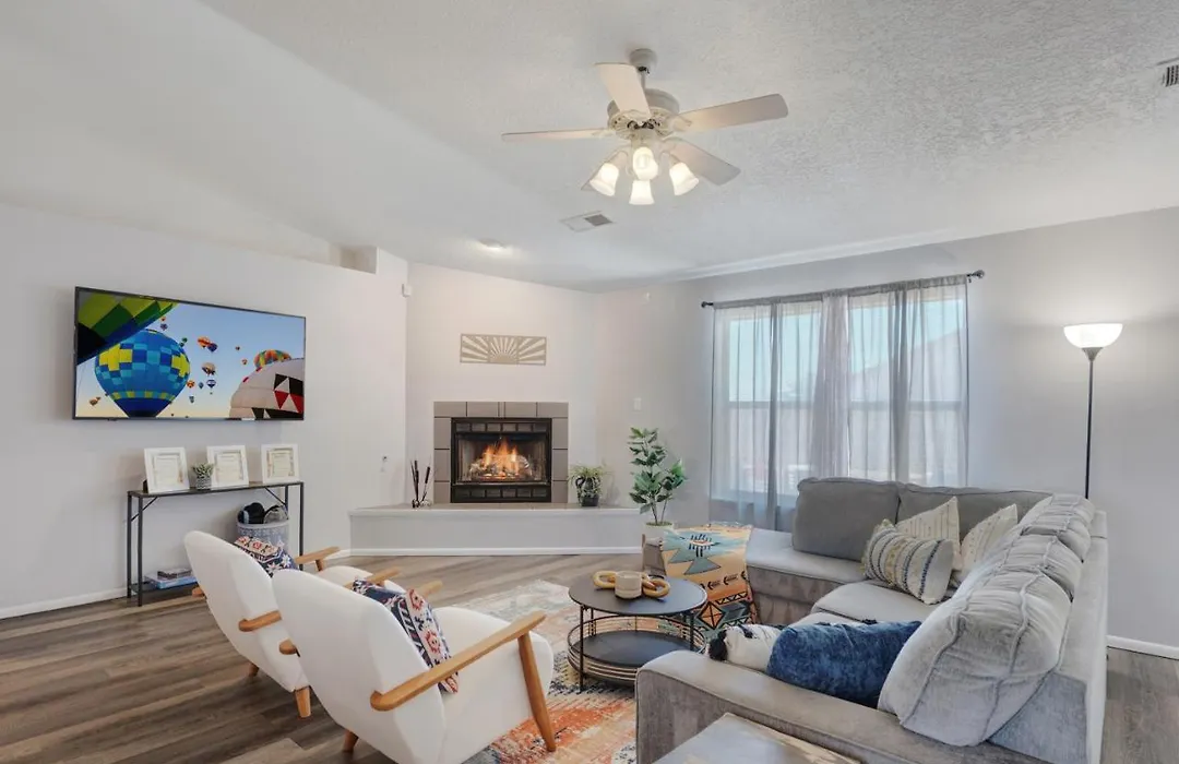 Los huéspedes pueden disfrutar de la comodidad de un una zona de comedor con minibar y servicio de tetera/cafetera de opciones para comer. La cocina también incluye nevera, horno y cristalería. Los huéspedes pueden llegar fácilmente al aeropuerto Internacional Sunport, que está a 39 minutos en coche de la Cheerful Vibrant 3Br - 3Tv - New Villa. Las opciones de entretenimiento y ocio incluyen bolera, zona de pícnic y campo de golf.